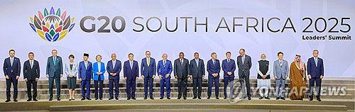 오른쪽부터 파블로 키르노 아르헨티나 외교부 장관, 파이살 빈 파르한 알 사우드 사우디아라비아 외무장관, 키어 스타머 영국 총리, 이재명 대통령, 나렌드라 모디 인도 총리, 프리드리히 메르츠 독일 총리, 에마뉘엘 마크롱 프랑스 대통령, 마크 카니 캐나다 총리, 주앙 로렌수 아프리카연합(AU) 의장, 올해 의장인 시릴 라마포사 남아프리카공화국 대통령, 루이스 이나시우 룰라 다시우바 브라질 대통령, 앤서니 앨버니지 호주 총리, 리창 중국 총리, 안토니우 코스타 유럽연합(EU) 정상회의 상임의장, 우르줄라 폰데어라이엔 유럽연합(EU) 집행위원장, 기브란 라카부밍 라카 인도네시아 부통령, 다카이치 사나에 일본 총리, 레제프 타이이프 에르도안 튀르키예 대통령, 에드가르 아브람 아마도르 사모라 재무부 장관, 막심 오레쉬킨 러시아 대통령실 부비서실장. 2025.11.22 [공동취재 제공. 재판매 및 DB 금지]