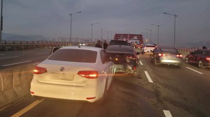 오늘(24일) 새벽 6시 반쯤 부산 강서구 신호대교에서 40대가 몰던 승용차가 신호를 기다리던 승용차를 들이받았습니다.