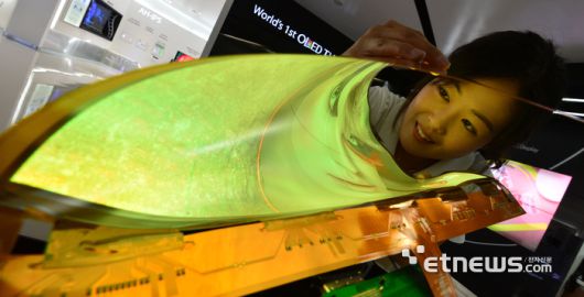 접고 구부릴 수 있는 플렉시블 디스플레이 시대가 도래했다. 웨어러블 기기 등 사물인터넷(IoT) 기반 융합 제품 혁신에 중요한 역할을 담당할 것으로 예상된다. LG디스플레이 직원이 최근 개발에 성공한 곡률반경도 30R을 구현하는 18인치 플렉시블 OLED를 보여주고 있다. 2014.09.19 / 김동욱기자 gphoto@etnews.com |