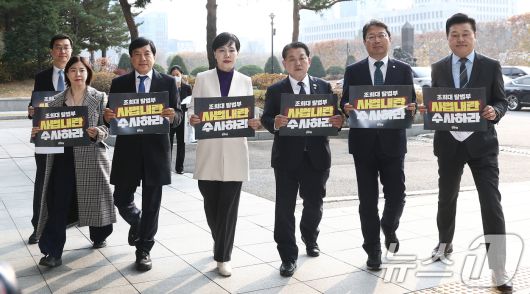 (서울=뉴스1) 김민지 기자 = 더불어민주당 전현희 3대특검 종합대응특위 총괄위원장을 비롯한 김병주, 이상윤, 장경태 의원 등이 24일 오후 내란특검 사무실이 마련된 서울 서초구 서울고등검찰청으로 조희대 대법원장에 대한 특검 수사를 촉구하는 항의 방문을 하고 있다. 2025.11.24/뉴스1