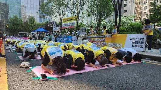 지난 5월12일 민주노총 서비스연맹 마트산업노조 홈플러스지부 구성원 57명이 종로구 청진공원에 설치된 농성장 앞에서 홈플러스 사태 해결을 위한 108배를 진행하고 있다. 박찬희 기자 |