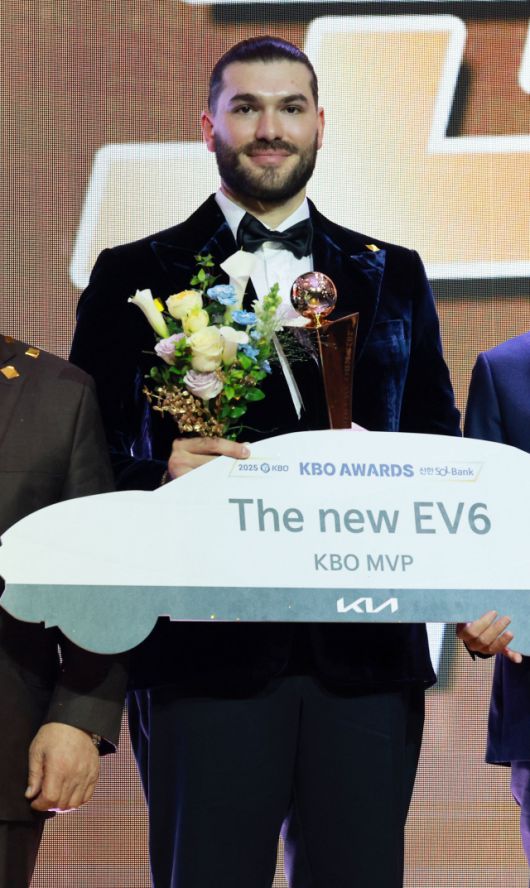 폰세는 24일 서울 송파구 롯데호텔 월드 크리스탈볼룸에서 열린 2025 신한 SOL뱅크 KBO 시상식에서 최우수선수상(MVP)을 수상했다. 기자단 투표 125표 중 96표(득표율 76%)를 획득해 삼성 라이온즈 타자 르윈 디아즈(23표)를 제치고 이 부문 수상자가 됐다. MVP로 뽑힌 폰세는 트로피와 함께 부상으로 전기자동차 더 기아 EV6을 받았다. 최고의 투수에게 주어지는 최동원상 수상에 이어 MVP까지 거머쥐며 올 시즌 활약을 인정 받았다.