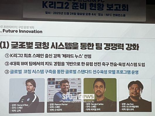 파주 프런티어 FC(이하 파주)는 24일 오후 4시 파주 NFC 내 컨퍼런스 룸에서 K리그2 준비 현황 보고회를 진행했다. 파주NFC는 앞으로 파주 프런티어 FC의 공식 클럽하우스로 사용될 예정이다. 이날 행사에서는 구단명 공모 시상식, 현황 보고회, 엠블럼 공개, 구단 운영 계획, 스폰서 협약식, 자산 활용 운영 방안 등을 공개했다.