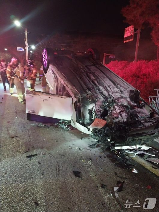 지난 21일 오전 2시께 전북 전주시 덕진구 덕진동 한 도로에서 k5 승용차가 인도 펜스를 들이받고 전복되는 사고가 발생했다. (전북소방본부 제공)/뉴스1 |