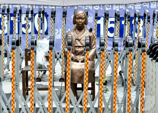 일본군 '위안부' 피해자 기림의 날인 14일 서울 종로구 옛 일본대사관 앞에 평화의 소녀상이 경찰 바리케이드에 둘러싸여 있다. 2024.8.14/뉴스1 ⓒ News1 유승관 기자 |
