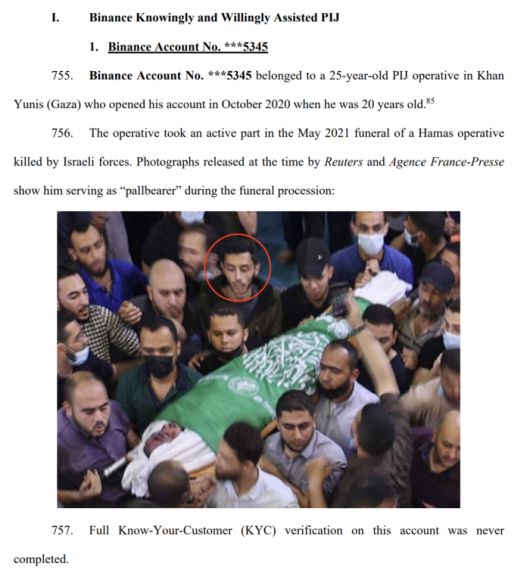 팔레스타인 이슬라믹 지하드(PIJ) 요원으로 알려진 바이낸스 계정 소유자(Binance Account No. ***5345)의 사진. 2021년 5월 하마스 요원의 장례식에서 운구자로 활동하는 모습이다. [출처=미국 노스다코타 연방법원] |
