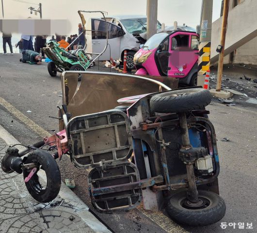 24일 제주 제주시 우도면 연평리 천진항 인근에서 62세 남성이 몰던 스타렉스 승합차(사진 맨 위 차량)가 항구 대합실 방향으로 돌진해 삼륜차(아래) 등과 충돌한 뒤 전신주를 들이받고 멈춰 서 있다. 이 사고로 3명이 숨지고 10명이 다쳤다. 경찰과 소방당국은 정확한 사고 경위를 조사하고 있다. 우도 주민 제공 |