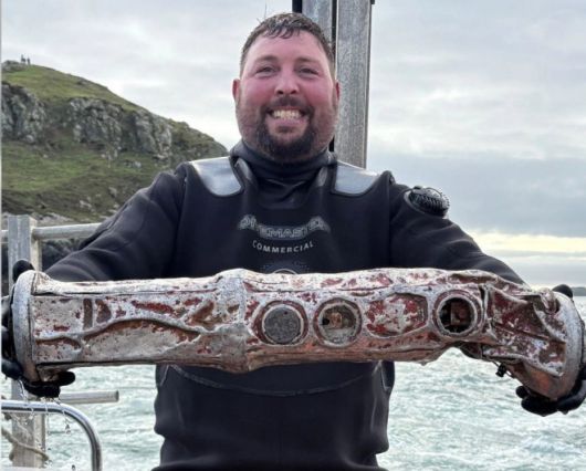 지난 15일 웨일즈 앞바다에서 건져 올린 소노부이 추정 장비를 스쿠버다이버가 들고 있다. 데이브 케나드 제공 |