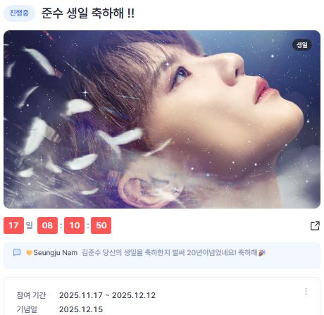 김준수에 대한 응원은 온라인에서도 활발하다. 스타트렌드 기념 탭에서는 그의 생일을 축하하는 이벤트가 진행 중이다. 팬들은 댓글을 통해 활동을 응원하며 따뜻한 메시지를 남기고 있다. 오랜 기간을 함께해온 팬들의 축하 인사는 김준수의 활동에 대한 꾸준한 애정을 보여준다.
