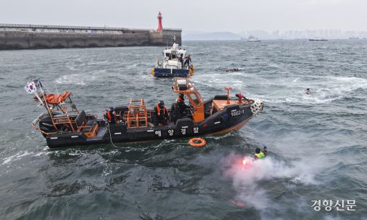 25일 인천 중구 연안여객터미널 앞 해상에서 열린 READY KOREA 4차 훈련에서 해양경찰 등 관계 당국이 조난자 구조 훈련을 하고 있다. 인천|성동훈 기자 |