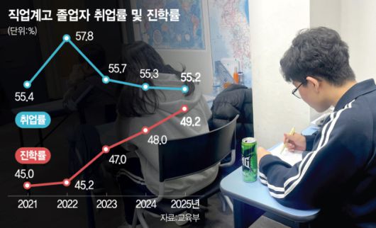 이날 교육부가 발표한 ‘2025 직업계고 졸업자 취업통계’를 보면 특성화고, 마이스터고, 일반고 직업반 등 직업계고 졸업자의 취업률은 2022년 57.8%에서 올해 55.2%로 매년 하락하고 있다. 반면 대학 진학률은 같은 기간 45.2%에서 49.2%로 상승해 전체 졸업생의 절반에 육박했다. 올해의 경우 전문대학 진학자는 1만 5648명(진학자 중 53.3%), 일반대학 진학자는 1만 3725명(46.7%)이었다.