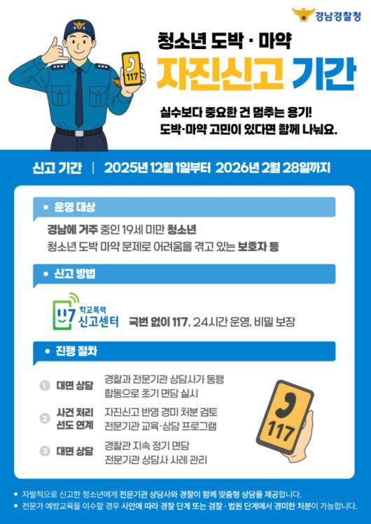 [창원=뉴스핌] 남경문 기자 = 경남경찰청은 청소년 도박과 마약 확산을 막기 위해 다음달 1일부터 내년 2월 28일까지 3개월간 자진신고 기간을 운영한다고 26일 밝혔다.