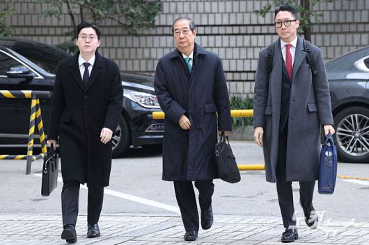 12·3 비상계엄 관련 내란 방조 등 혐의를 받는 한덕수 전 국무총리가 26일 오전 서울 서초구 서울중앙지방법원에서 열린 1심 결심 공판에 출석하고 있다.