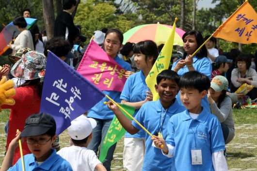이주민 자녀와 함께 하는 무지개축제가 열린 서울숲공원에서 참가 어린이들이 유엔 아동권리협약을 담은 깃발을 흔들며 풍물패와 길놀이를 벌이고 있다. 이정아 기자 leej@hani.co.kr