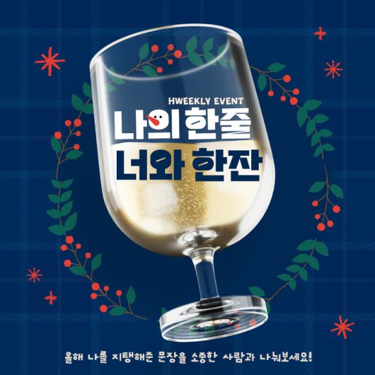 한겨레 주간 뉴스레터 ‘휘클리’가 ‘나의 한줄, 너와 한잔’ 이벤트를 27일 정오 이후 휘클리 뉴스레터 또는 휘클리 공식 인스타그램(@h.weekly)에서 공개한다. 올해 마음속 간직하고픈 문장을 보내주면, 당첨자에게 고블렛 잔 2개를 선물할 예정이다. 황인솔 소셜에디터