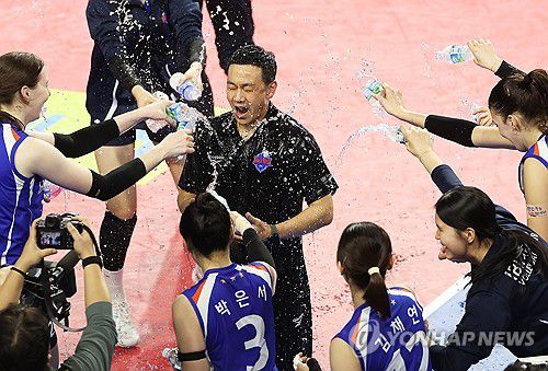(화성=연합뉴스) 홍기원 기자 = 26일 경기도 화성종합경기타운 실내체육관에서 열린 프로배구 V리그 여자부 IBK기업은행 알토스와 흥국생명 핑크스파이더스의 경기. 세트스코어 3-0으로 승리한 IBK기업은행 여오현 감독대행이 선수들의 축하를 받고 있다. 2025.11.26