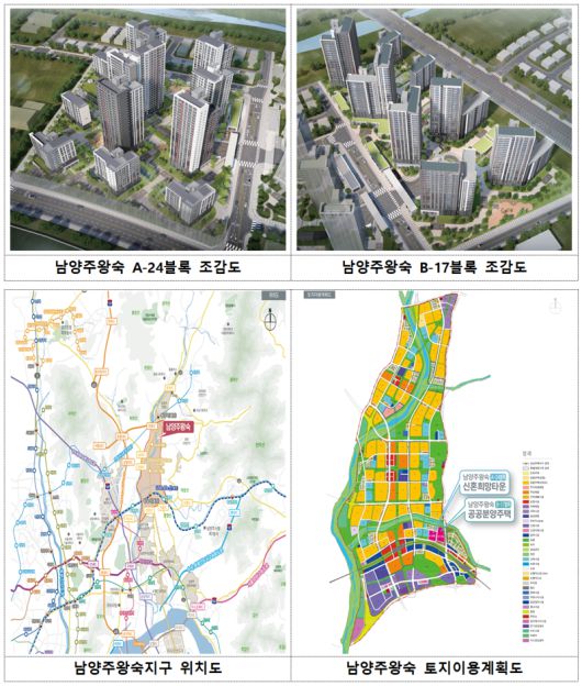 남양주왕숙지구 조감도, 토지이용계획도, 위치도(위부터 시계방향). 국토교통부·LH 제공 |