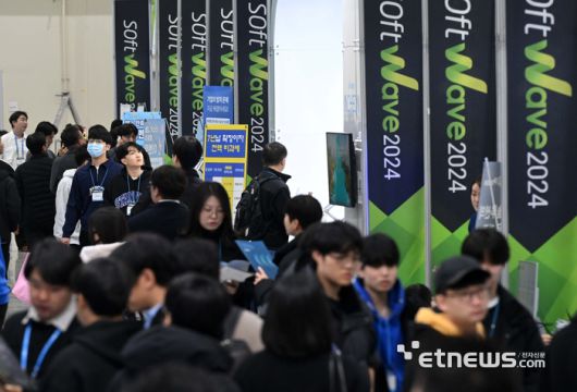 국내 최대 소프트웨어 전시회인 '소프트웨이브 2024'가 4일 서울 삼성동 코엑스에서 열렸다. 개막 이튿날인 5일 전시장이 참관객으로 붐비고 있다. 김민수기자 mskim@etnews.com |