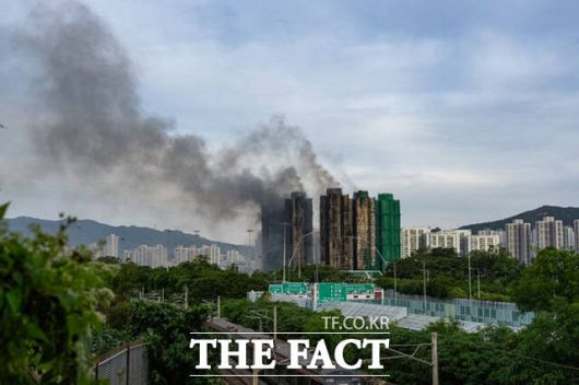26일(현지시간) 홍콩 북부 타이포 구역의 '웡 푹 코트' 아파트 단지에서 화재가 발생해 불길이 하늘로 치솟고 있다. /홍콩=AP.뉴시스 |