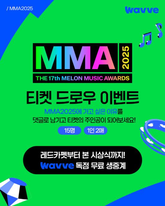 웨이브는 ‘MMA2025’ 독점 생중계를 기념해 12월 7일까지 티켓 증정 이벤트도 진행한다. 웨이브 공식 인스타그램에서 참여할 수 있으며, 추첨을 통해 총 15명에게 2매씩 티켓을 제공한다.