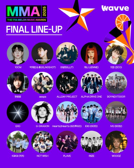 올해 ‘MMA2025’는 개최 전부터 화려한 라인업으로 주목받고 있다. 지드래곤(G-DRAGON), 박재범, 제니, EXO, 아이브(IVE), 지코, 에스파(aespa), 라이즈(RIIZE), 보이넥스트도어(BOYNEXTDOOR), 플레이브(PLAVE), NCT WISH, 아일릿(ILLIT) 등 K-POP 톱 아티스트들이 무대를 꾸민다. Hearts2Hearts, KiiiKiii, ALLDAY PROJECT, IDID, ALPHA DRIVE ONE 등 떠오르는 아티스트도 무대에 오른다.