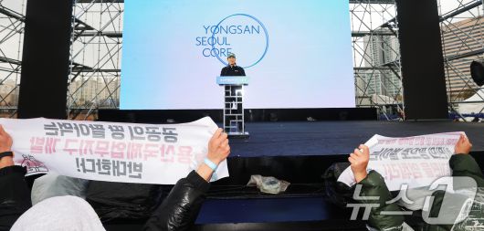 (서울=뉴스1) 오대일 기자 = 27일 오후 서울 용산구 정비창에서 열린 용산국제업무지구 도시개발사업 기공식에서 오세훈 서울시장의 비전 발표가 시작되는 순간 용산정비창 공대위 소속 회원들이 개발 계획 철회를 촉구하는 손피켓을 들고 기습시위를 하고 있다. 2025.11.27/뉴스1
