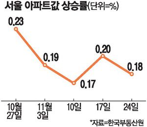 27일 한국부동산원이 발표한 11월 넷째주(지난 24일 기준) 전국 주간 아파트 가격동향에 따르면 서울 아파트 매매가격은 0.18% 상승하며 전 주(0.20%) 대비 상승폭이 소폭 감소했다. 지난주 기준으로 4주(10월 20일 0.50%→27일 0.23%→11월 3일 0.19%→10일 0.17%→17일 0.20%) 만에 상승폭이 확대돼 주목을 받았는데, 상승세가 다시 둔화된 것이다.
