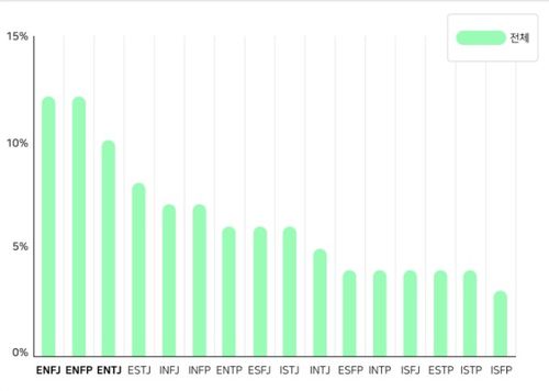MBTI 유형 중에서는 ENFJ, ENFP, ENTJ 비중이 가장 높았고 이러한 유형은 가수·기업인·온라인콘텐츠창작자 직업군에 특히 많이 분포했다.