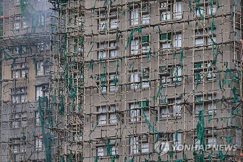 화재로 무너지는 홍콩 '웡 푹 코트' 아파트 대나무 비계 |