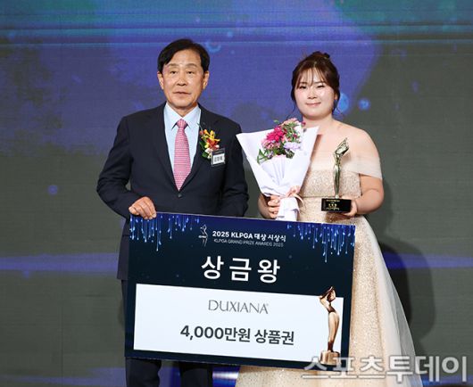 [스포츠투데이 권광일 기자] 프로골퍼 홍정민이 28일 오후 서울 강남구 삼성동 그랜드 인터컨티넨탈 서울 파르나스에서 열린 2025 KLPGA 대상 시상식에 참석해 상금왕을 수상하고 있다. 2025.11.28. [스포츠투데이 권광일 기자 sports@stoo.com]