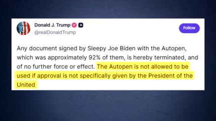 트럼프 대통령은 현지 시간 28일 SNS 트루스소셜에 올린 글에서 "조 바이든이 오토펜으로 서명한 약 92%에 해당하는 모든 문서가 효력을 상실하고 더 이상 법적 효력을 가지지 않는다"고 말했습니다.