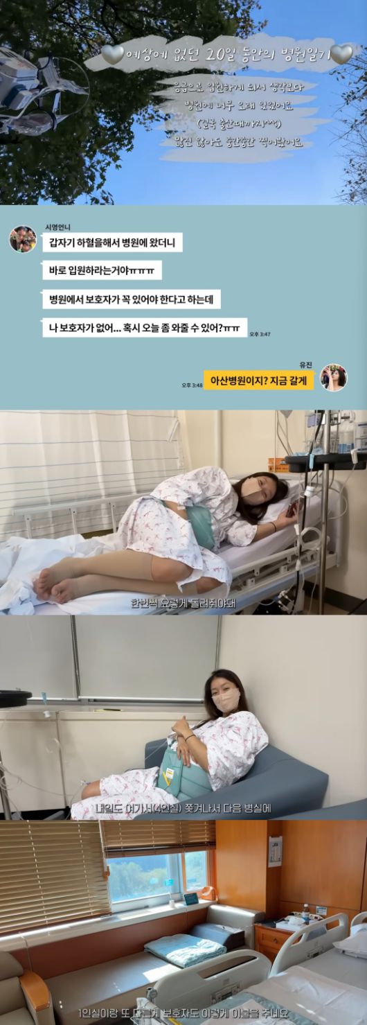 그는 "4인실에 있으면서 보호자 해주는 친구들한테 고맙고 미안했는데 1인실 기다리던 중에 특실이 나와서 출산 때까지 여기에 있기로 했다. 부엌도 있고 인터넷도 된다. 보호자 침대가 커서 좋았다. 보호자에게 이불도 준다"고 만족감을 드러냈다.