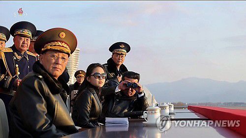 (서울=연합뉴스) 북한 공군 창설 80주년 기념행사가 지난 28일 갈마비행장에서 진행됐다고 조선중앙TV가 30일 보도했다. 김정은 국무위원장와 딸 주애가 시위비행을 참관하고 있다. [조선중앙TV 화면] 2025.11.30