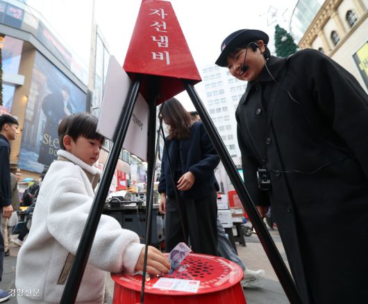 한 어린이가 30일 서울 중구 명동거리에 설치된 구세군 자선냄비에 성금을 기부하고 있다. 이 캠페인은 ‘희망의 빛’을 주제로 전국 17개 시도 350여곳에서 12월31일까지 진행된다. 올해는 현금 없이 기부가 가능한 근거리무선통신(NFC) 기부 시스템이 도입됐다.