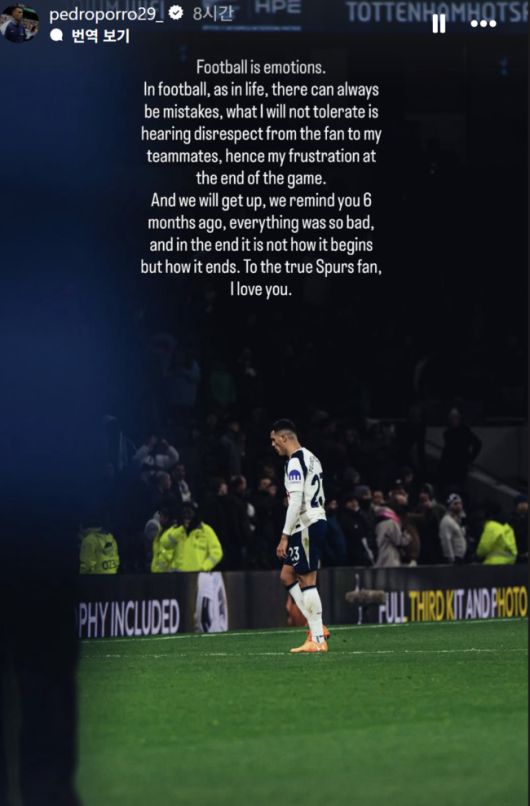포로는 30일 자신의 SNS에 "축구는 감정이다. 축구에서도, 삶과 마찬가지로 실수는 언제나 있을 수 있다. 내가 용납할 수 없는 것은 팬이 내 팀 동료들에게 무례하게 구는 것이며, 그래서 경기 끝에 내가 분노한 것이다. 우리는 다시 일어설 것이다. 6개월 전을 떠올려보자, 모든 것이 너무나 나빴다. 결국 중요한 것은 시작이 아니라 끝이다. 진정한 토트넘 팬들에게, 나는 여러분을 사랑한다"라는 글을 게시했다.