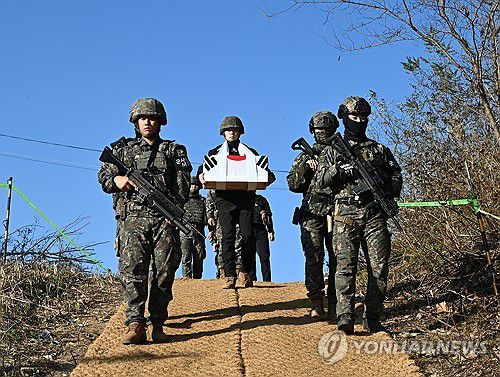 (서울=연합뉴스) 국방부는 10월 15일부터 지난달 28일까지 40여일 동안 중부전선 비무장지대(DMZ) 내 백마고지에서 6·25전쟁 전사자 유해발굴 작업을 실시해 25구의 유해와 1천962점의 유품을 수습했다고 1일 밝혔다. 사진은 유해를 봉송하는 모습. 2025.12.1 [국방부 제공. 재판매 및 DB 금지]