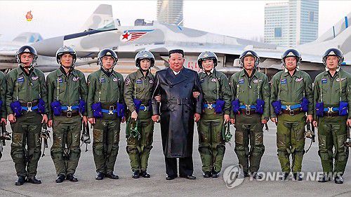 (서울=연합뉴스) 김정은 북한 국무위원장이 지난달 28일 갈마비행장에서 열린 공군 창설 80주년 기념행사에 참석해 시위비행을 마친 비행사들과 기념촬영을 하고 있다. 김 위원장 양옆으로 쌍기편대 시위비행을 진행한 여성 비행사 안옥경, 손주향이 서 있다. [조선중앙TV 화면] 2025.12.1