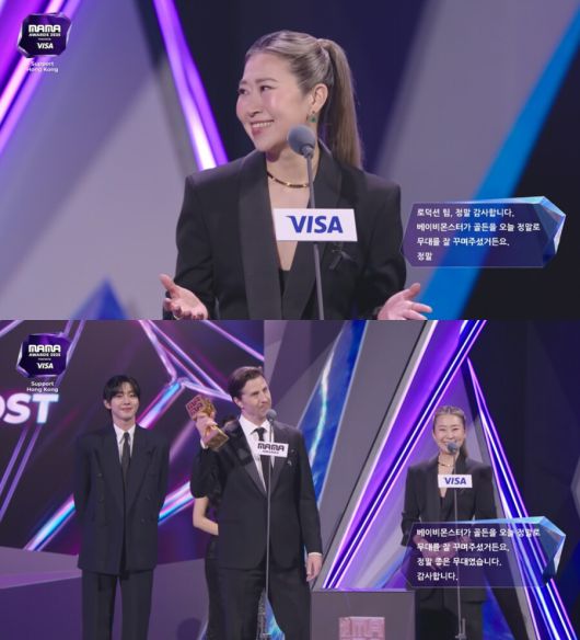 특히 이날 무대를 앞두고 베이비몬스터는 대기실에서 '케데헌'의 메기 강, 크리스 에펠한스 감독과 뜻깊은 만남을 가졌다. 이들은 서로 정성스럽게 준비한 선물을 교환하며 따뜻한 분위기 속에서 우정을 나눴다는 후문이다.