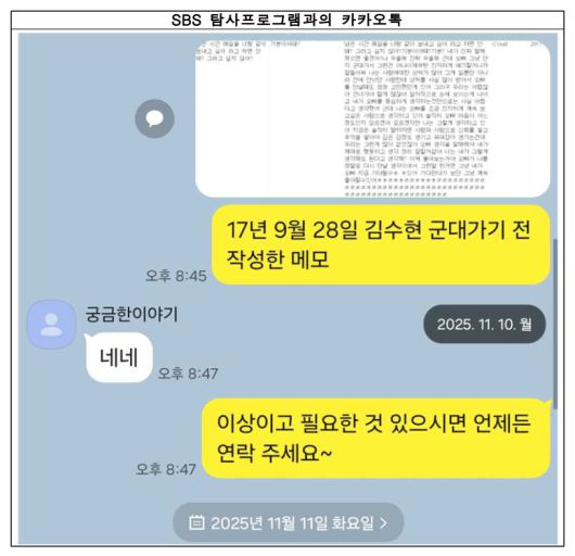 '궁금한 이야기 Y' 제작진과의 전화 통화를 공개한 부 변호사는 "본인의 실수로 '군대'라는 단어를 보지 못해 착각한 상태에서 오히려 조작 프레임을 재차 씌웠다. 곧 발표될 수사기관의 결과를 기다려 달라는 부탁을 간곡히 드린다"며 말을 마쳤다.