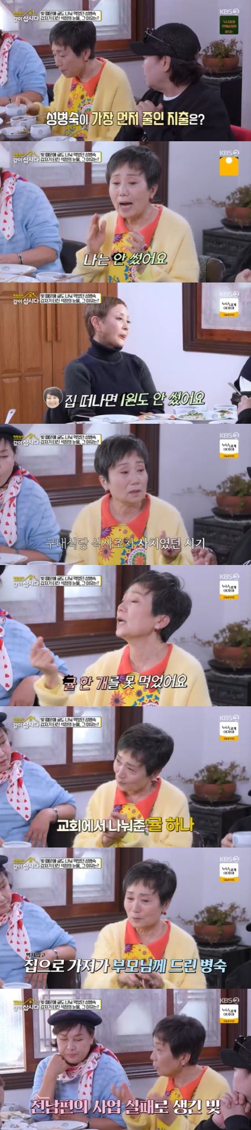 혜은이는 "난 내가 제일 어려울 때 지출에서 먼저 줄인 게 사우나 비용이었다"고 말했고, 성병숙은 "집 떠나면 1원도 안 썼다. KBS 구내식당 밥도 안 먹었다. 하여튼 1원도 안 썼다. 10년을 그렇게 살았다. 특히 과일을 못 먹었다. 귤 한개를 못 먹었다. 그러다 교회를 갔는데 귤을 주더라. 그걸 받아서 집에 가서 아버지 먼저 주고 엄마를 주고 그랬다"며 "빚을 내가 만져본 것도 아니고 갖고 있어 본 것도 아닌데 그걸 갚기 위해 하루 4시간 잤다. 그때 너무 감사하게 여기저기서 일을 주시더라. 하루만 생각하고 살았다. 얼마는 버는지 모르고 쓰는 건 하나도 안 썼다. 기름 값 외에는 안 썼다. 월세를 살았고 수입 생기면 세금 정산부터 했다"며 당시를 회상했다.