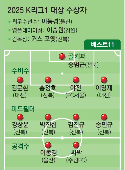 이동경은 이날 베스트11 공격수 부문에 선정된 데 이어 드리블과 키패스 등 여러 지표를 종합해 선정하는 아디다스 포인트 대상도 받아 3관왕의 영예를 안았다. 울산은 사상 첫 네 시즌 연속이자, 역대 최다인 통산 8번째 MVP를 배출한 구단이 됐다.