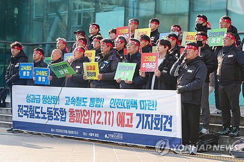 (서울=연합뉴스) 조현영 기자 = 전국철도노동조합(철도노조)은 2025년 성과급 정상화 등 임금교섭 핵심 요구안이 관철되지 않을 경우 오는 11일부터 총파업에 들어간다고 밝혔다.