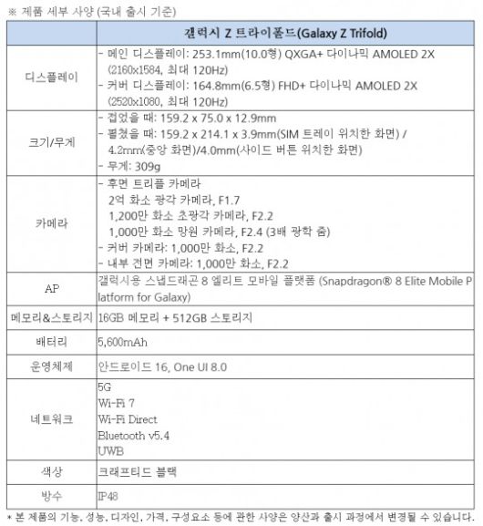 [한국금융신문 곽호룡 기자] 삼성전자가 3단 폴더블 스마트폰 '갤럭시 Z 트라이폴드'를 전격 공개했다. 삼성전자 첨단기술을 총 망라한 최상위급 모델로, 출시 가격이 359만원으로 책정됐다. 12일 국내 출시할 예정이다.