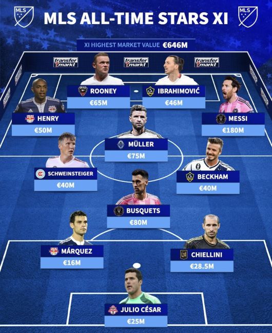 축구 통계 전문 사이트 ‘트랜스퍼마르크트’는 2일(한국시간) 미국프로축구 메이저리그사커(MLS) 역사상 가장 화려한 스타들을 모은 베스트 11을 발표했다. 이번 리스트는 일반적으로 예상하는 실력 기준이 아닌 MLS로 이적하던 당시 선수들이 지녔던 시장가치만을 기준으로 삼았다. 미국 무대에서 보여준 활약은 전혀 고려하지 않은 구성이다.