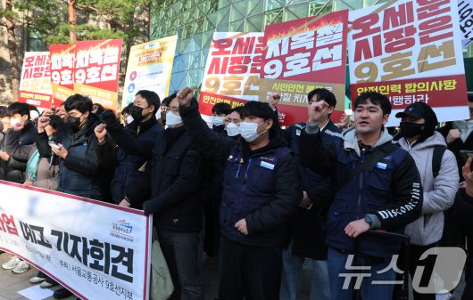 (서울=뉴스1) 오대일 기자 = 서울교통공사 9호선 노동조합 조합원들이 2일 오전 서울 중구 서울시청 앞에서 열린 총파업 예고 기자회견에서 안전인력 합의 미이행을 규탄하는 구호를 외치고 있다. 노조는 이 자리에서 "안전을 위한 기본적인 인력 충원 합의마저 미이행하는 서울시를 더이상 좌시할 수 없다"며 오는 3일 준법투쟁을 시작으로 11일 총파업에 돌입하겠다고 밝혔다. 2025.12.2/뉴스1