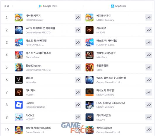애플 앱스토어도 구글 플레이와 마찬가지로 큰 변화 없이 유사한 흐름이 이어지고 있다. '메이플 키우기'가 1위를 지키는 가운데 '리니지M', '라스트 워: 서바이벌', '한게임 섯다&맞고', '운빨존많겜', '화이트아웃 서바이벌', '마비노기 모바일' 등이 TOP 10을 형성하고 있다.