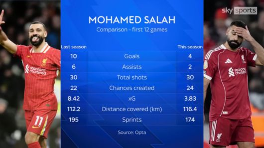 리버풀은 최근 프리미어리그 7경기 중 6경기를 패했고, 모든 대회를 통틀어 12경기에서 9패를 기록하는 극심한 부진에 빠져 있었다. 그 중심에는 살라의 기량 저하가 있다. 그는 수비 가담을 최소화하는 대신 공격에서 파괴력을 온전히 발휘할 수 있도록 전술적 특혜까지 받고 있지만, 최근 들어 영향력이 뚝 떨어졌다.