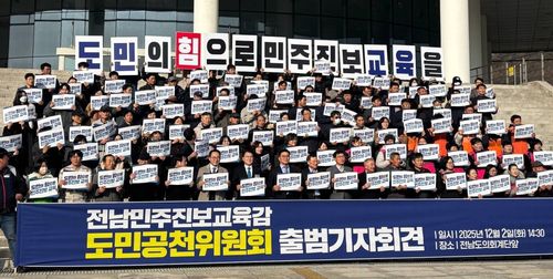 (무안=연합뉴스) 여운창 기자 = 전국교직원노동조합 전남지부·민주노총 전남본부 등 전남지역 교원·사회·노동단체는 2일 오후 전남도교육청 앞에서 기자회견을 갖고 내년 지방선거에서 현 김대중 도교육감에 맞설 후보 단일화를 위한 '민주진보교육감 도민공천위원회'를 공식 출범했다.