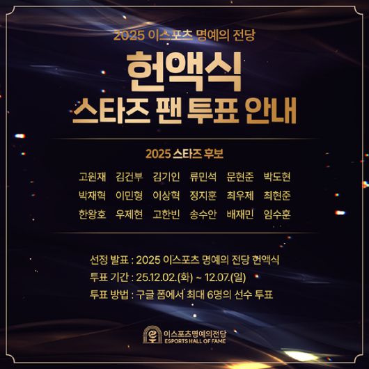 [아이뉴스24 문영수 기자] 한국e스포츠협회가 오는 16일 개최되는 '2025 이스포츠 명예의 전당 헌액식'을 앞두고 팬들이 직접 선정하는 '스타즈' 투표를 7일까지 진행한다.