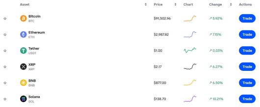 이날 오전 6시 50분 글로벌 거래소 코인베이스에 따르면 주요 코인이 모두 상승세를 기록하며 비트코인 주도의 반등장이 확인됐다. 비트코인 가격은 9만1502.96달러로 5.92% 오르며 9만 달러 선 위에서 강하게 반등했다.